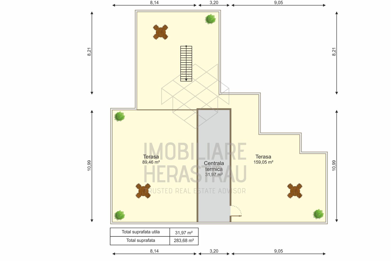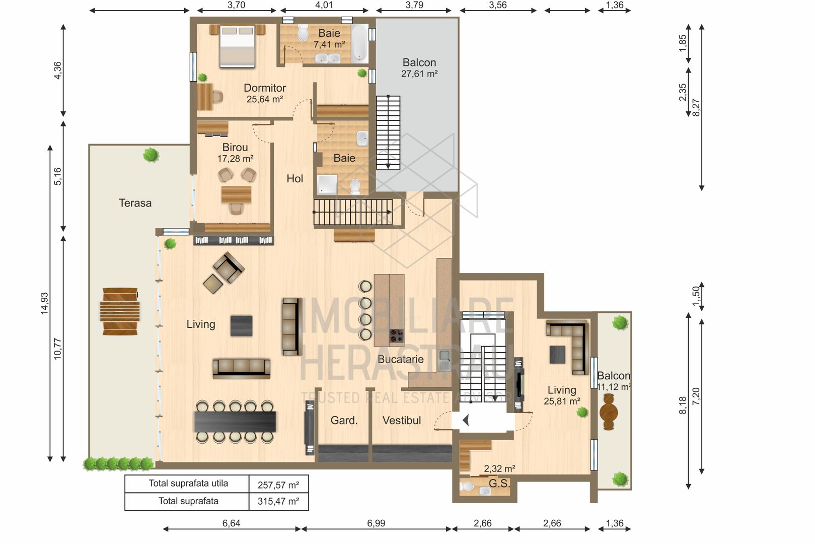 This is the reason for the outstanding decoration of this property located near Herastrau Park, an apartment with a usable surface of 382 sqm, highlighted and used to the maximum, divided harmoniously between the an ample living-room, type wide-open which includes the dinning area and kitchen, five bedrooms, six bathrooms, dressings and halls, to which we can add 180 square meters of usable area of extensive terraces. At the first level( 4-th)the apartment has a spacious living area, dining area of 75 sqm, 1 bedroom, one office, kitchen, 2 bathrooms. The 4-th floor has two balconies of 42 sqm.